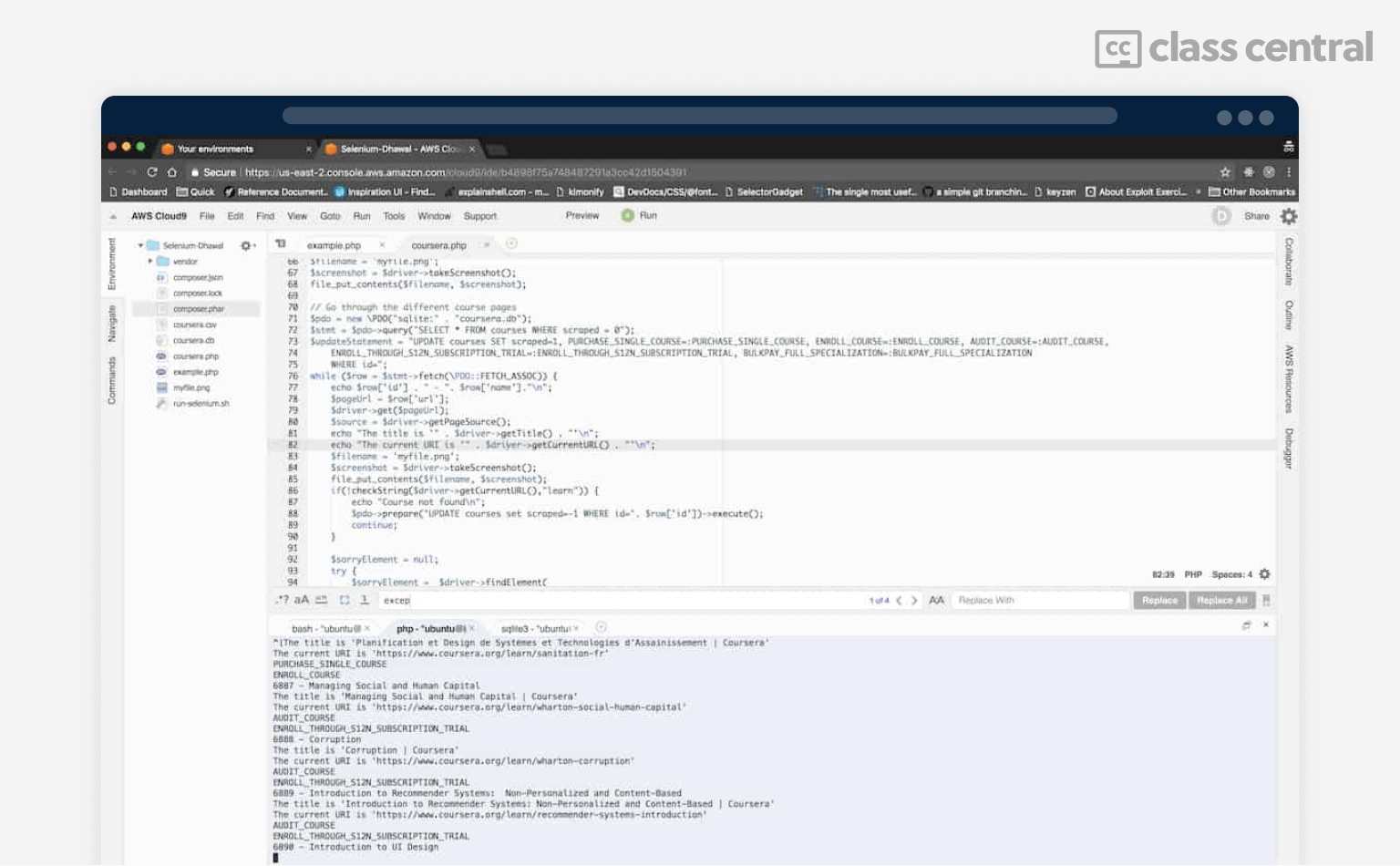 मूल रूप से, मैंने अपने पाठ्यक्रमों की जांच के लिए ब्राउज़र ऑटोमेशन टूल सेलेनियम का उपयोग किया था। मेरे सहयोगी बॉब ने मुझे AWS उदाहरण और Cloud9 IDE के साथ सेट किया , जहाँ मैं यह स्वचालन कर सकता था। नीचे सेटअप का एक स्क्रीनशॉट है। (हाँ, मैं PHP पसंद करता हूँ।)