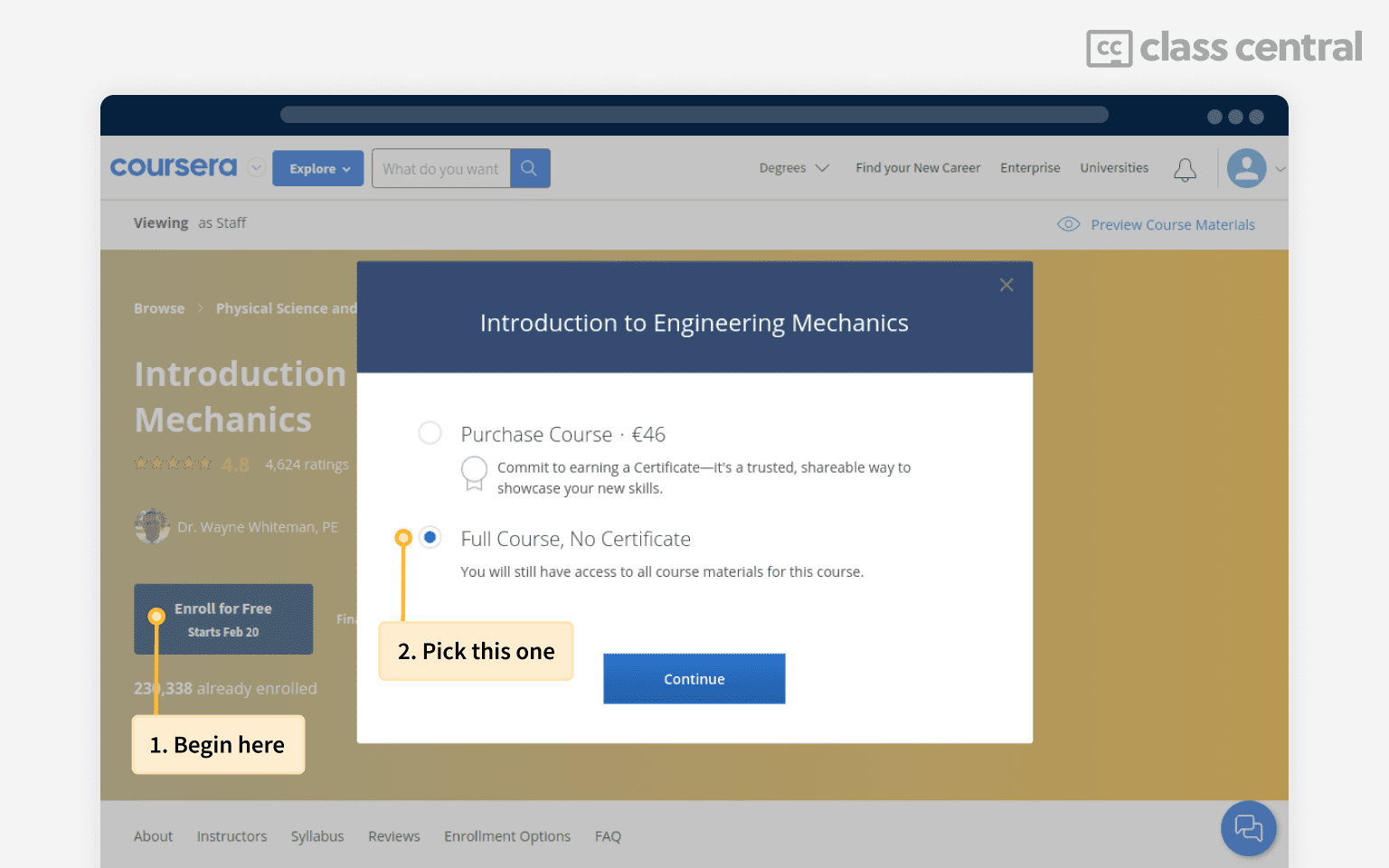 सबसे बड़ी चुनौती यह पता लगाना है कि कौन से कौरसेरा पाठ्यक्रम पूरी तरह से निःशुल्क हैं। कौरसेरा वेबसाइट कोई "मुफ्त कोर्स" फ़िल्टर प्रदान नहीं करती है ( क्लास सेंट्रल हालांकि 😊 करता है)। यह जानने के लिए कि क्या कोई कोर्स पूरी तरह से मुफ़्त है, आपको कौरसेरा में लॉग इन करना होगा, कोर्स में नामांकन करना होगा और “ पूर्ण पाठ्यक्रम, कोई प्रमाणपत्र नहीं ” विकल्प की तलाश करनी होगी।