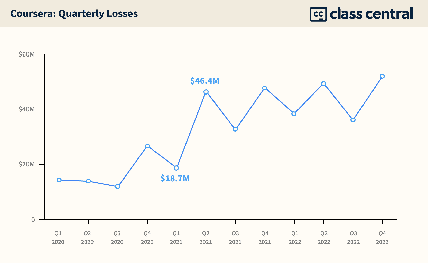 लेकिन 2023 के लिए, कौरसेरा सीएफओ को उम्मीद है कि कंपनी को "2023 में $ 25 मिलियन का खर्च उठाना होगा, जो बिक्री और विपणन प्रयासों, सामग्री उत्पादन और उत्पाद विकास सहित कार्यक्रम के लिए हमारे ऐतिहासिक खर्च के समान होगा।"