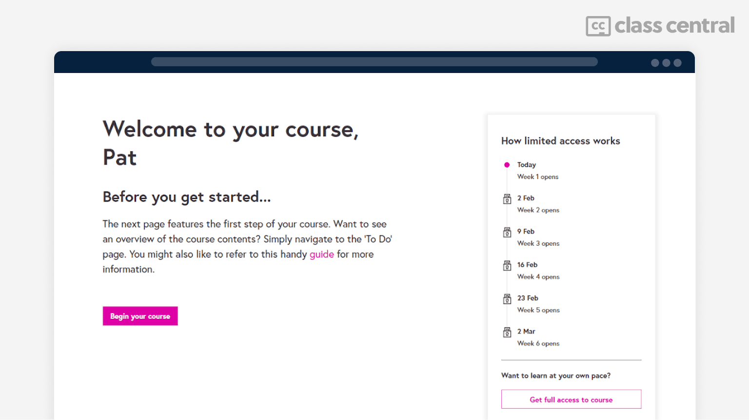 किसी पाठ्यक्रम का नि:शुल्क ऑडिट करते समय, सामग्री अब एक बार में जारी करने के बजाय सप्ताह-दर-सप्ताह जारी की जाती है।