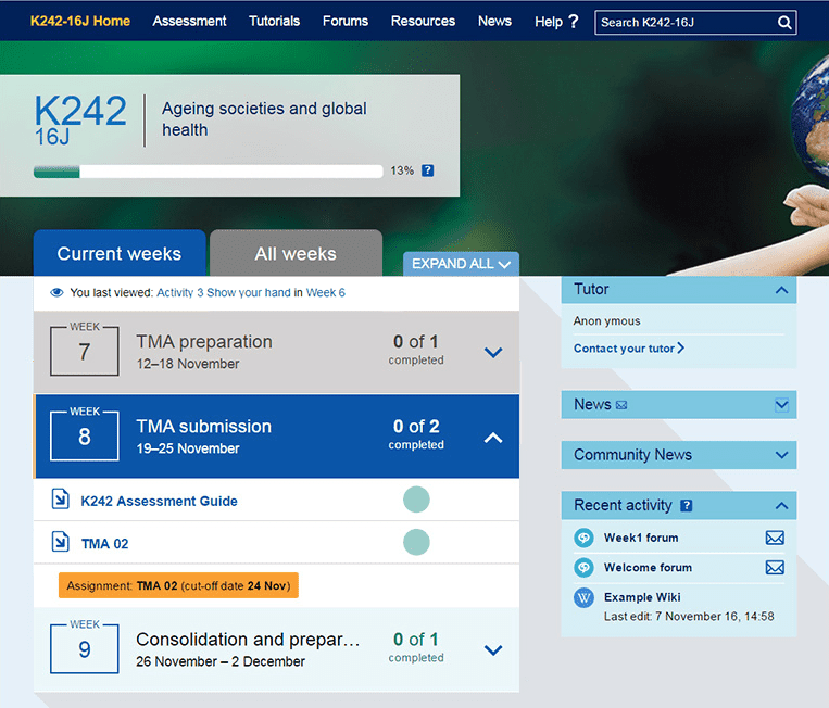 प्रत्येक पाठ्यक्रम की अपनी वेबसाइट है जिसके केंद्र में एक अध्ययन योजनाकार है। योजनाकार को गतिविधियों की साप्ताहिक जाँच सूची में विभाजित किया गया है, जहाँ प्रत्येक गतिविधि संबंधित पाठ्यक्रम सामग्री से जुड़ती है। जैसा कि आप सामग्री के माध्यम से आगे बढ़ते हैं, आप अपनी प्रगति को ट्रैक करने के लिए अपनी सूची से आइटम चेक करते हैं। ध्यान दें कि हालांकि अध्ययन स्व-पुस्तक है, आकलन में कठिन समय सीमा होती है।